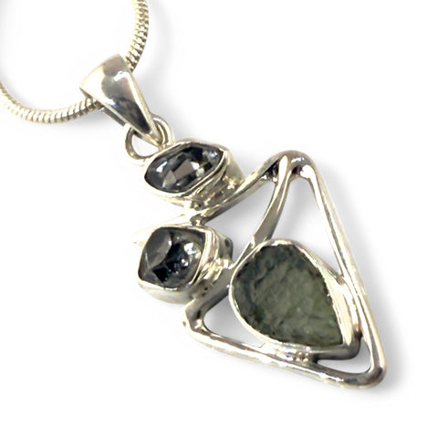 Moldavite Rough, Herkimer Diamond, & Campo de Cielo Rough Sterling Silver Ribbon Pendant
